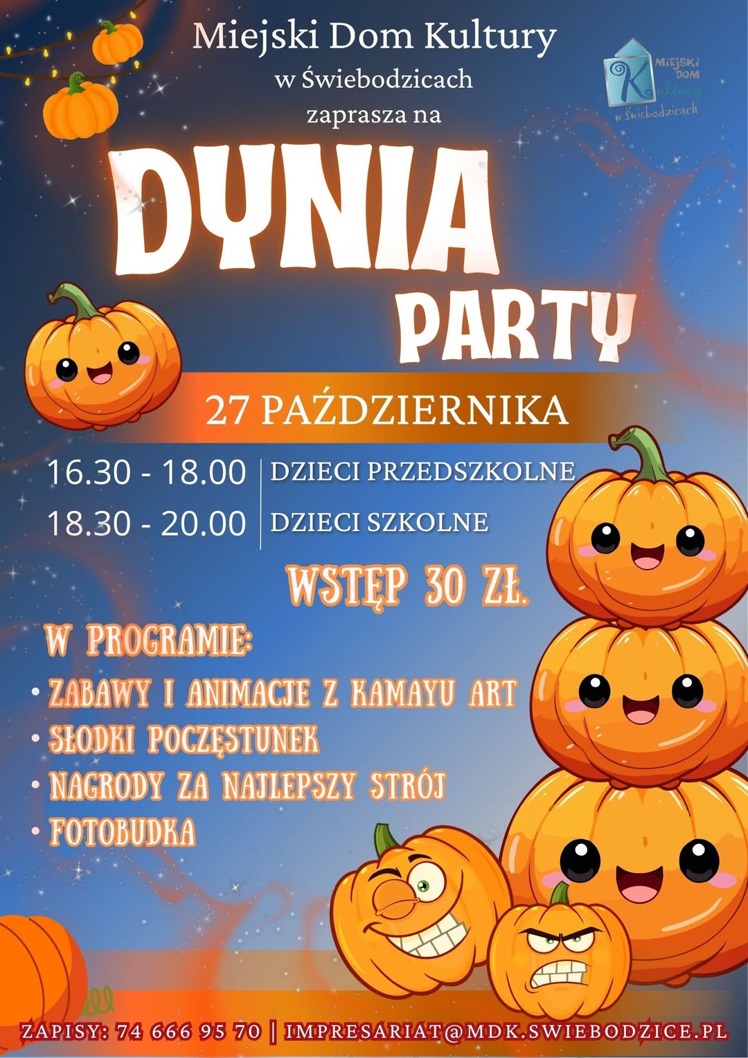 Serdecznie zapraszamy wszystkie dzieci na Dynia Party, które odbędzie się 27 października w Miejskim Domu Kultury W Świebodzicach.